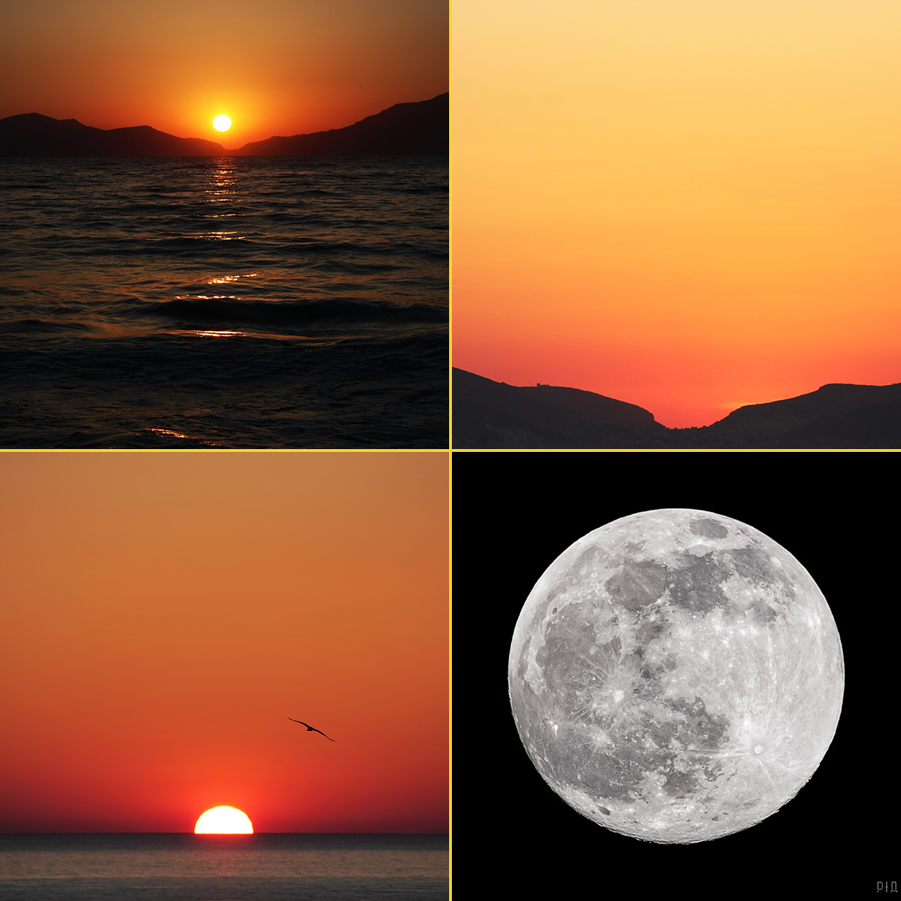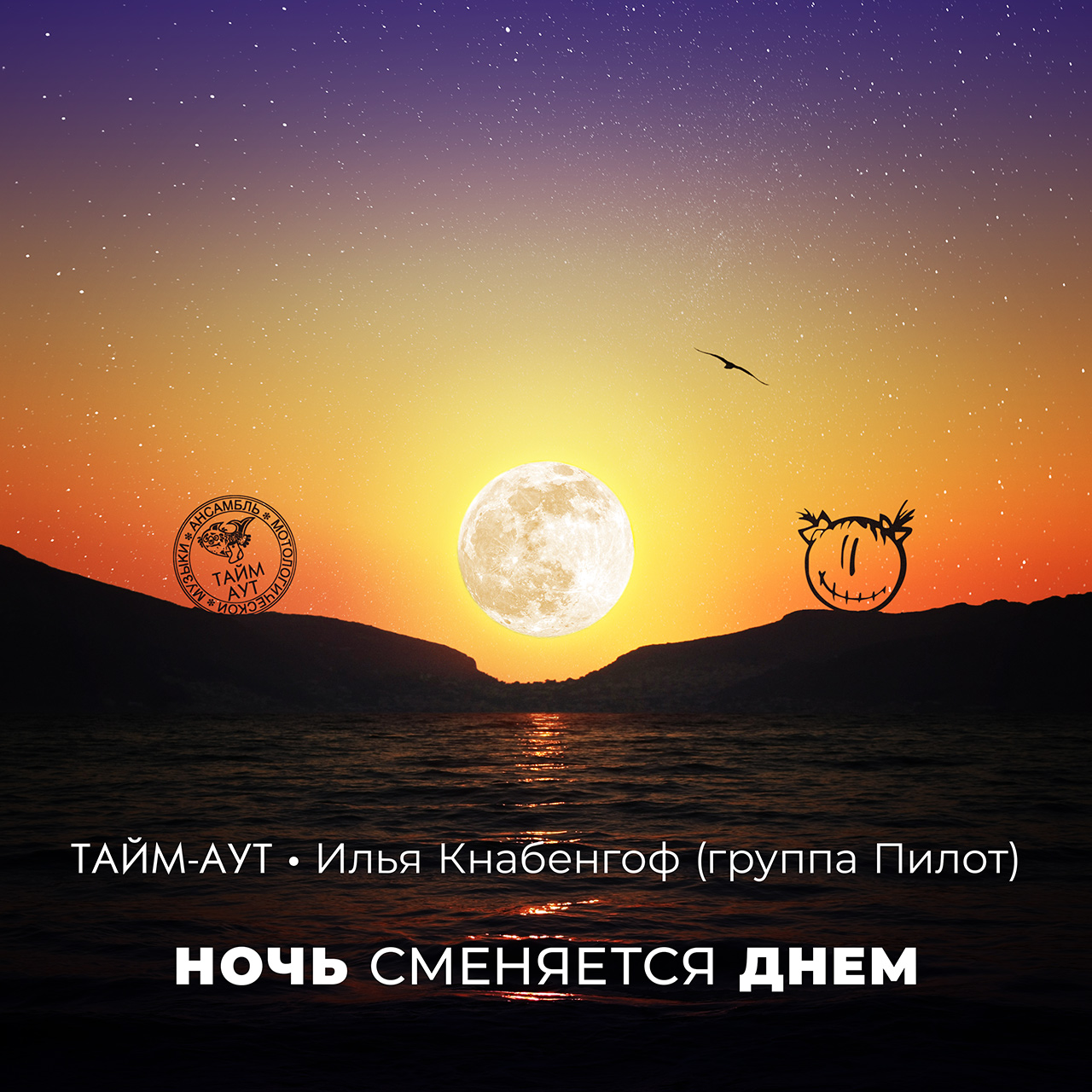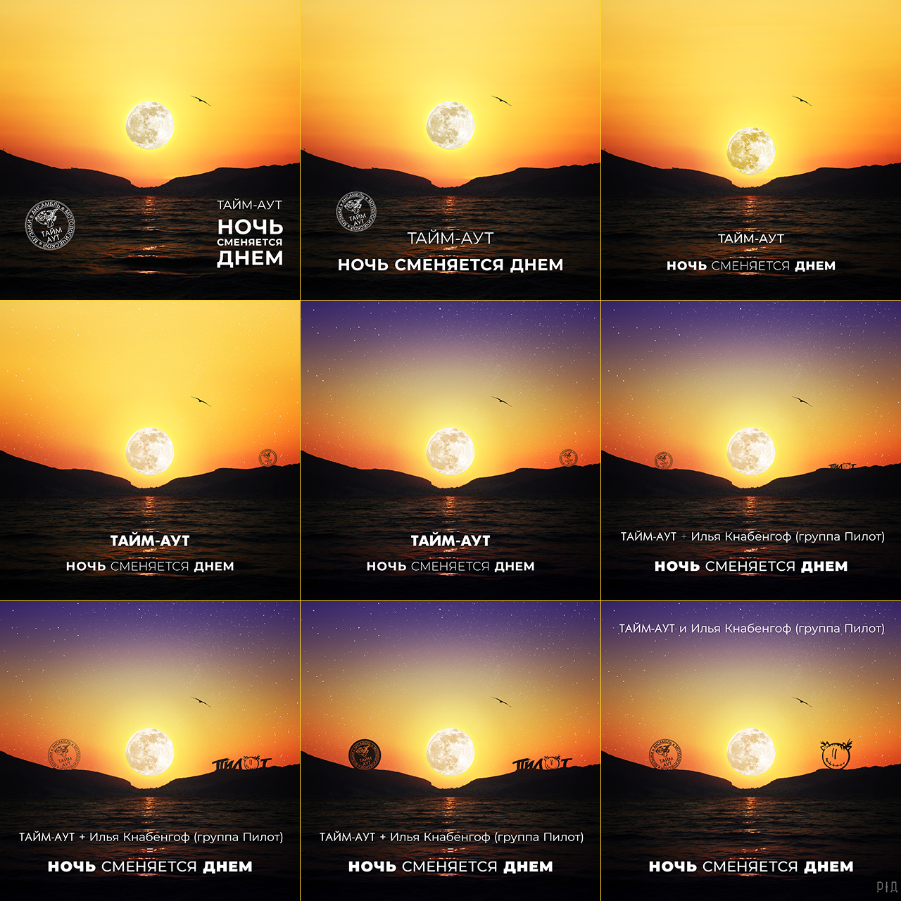 Музыка, слова, фото. Часть 4: «Ночь сменяется днем»2025 г. Про итальянскую чайку, греческий закат в роли рассвета и московскую Луну в роли Солнца. Задача: оформить обложку цифрового сингла «Ночь сменяется днем» группы Здесь я пробежался впереди паровоза: так как песню неоднократно исполняли на концертах, у меня в голове возник некий образ того, как могла бы выглядеть обложка. К моменту, когда поступила задача придумать дизайн, у меня уже был проработанный эскиз. Идея состояла в том, чтобы показать смену дня и ночи и добавить некоторый парадокс или абсурдную деталь, что подчеркнуло бы концепцию творчества группы. Так появился этот коллаж. В роли рассвета выступил, разумеется, закат. Два фото сделаны на греческом острове Кос 2 июля 2016 года с разницей в шесть минут — с пляжа в деревушке Мармару снят соседний остров Калимнос. Море с солнечной дорожкой взято из первого снимка, а седловина гор из второго. Вместо Солнца я вставил в изображение Луну, снятую 8 февраля 2020 года в Москве. Силуэт чайки, как ни странно, тоже взят из фотографии заката, но сделанной в 30 июня 2013 года в итальянском городе Ливорно. ![]() Первоначально рассвет был ![]() Релиз: 20.12.2024. ![]() Примечание: процесс координировался заказчиком; здесь описана только моя часть работы, которая состояла в отборе и обработке снимков, создании эскизов, верстке текста и размещении элементов композиции на изображении. В предыдущих сериях